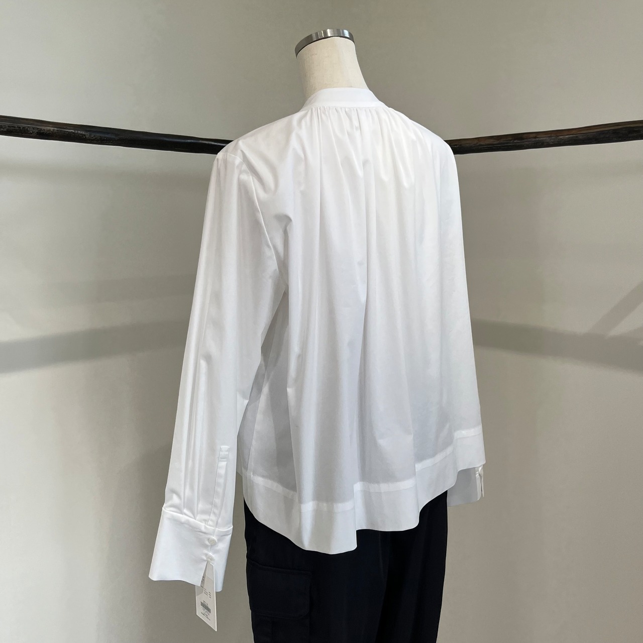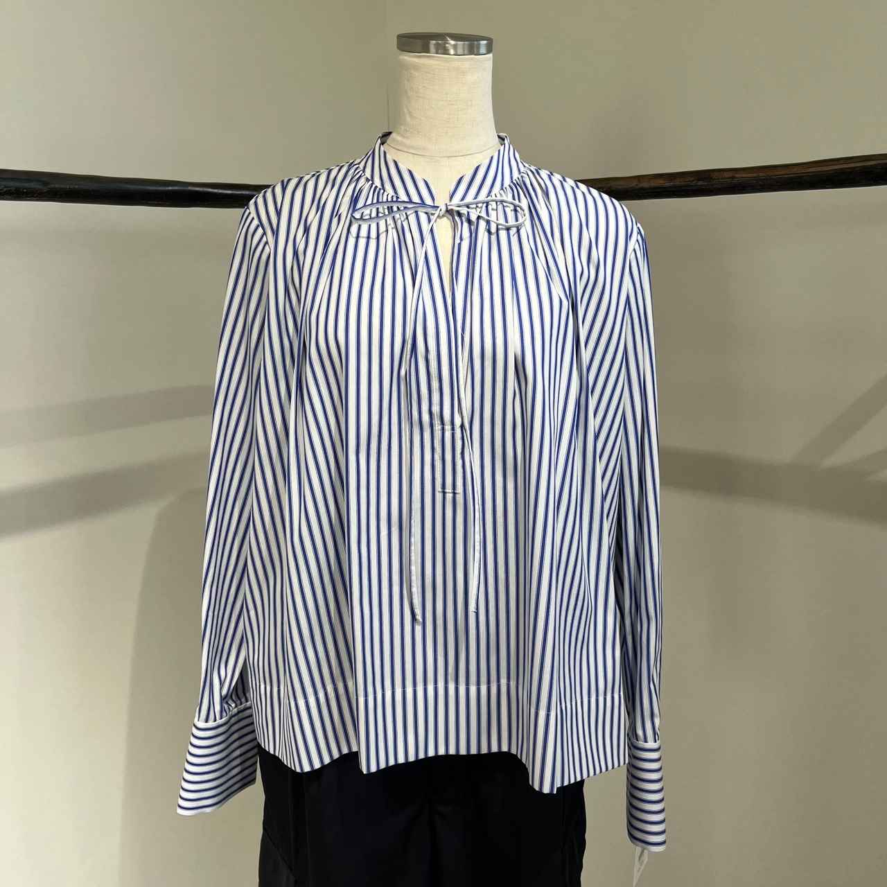 ワイドパンツでもスカートでも、ボトムスが合わせやすい1枚です。
