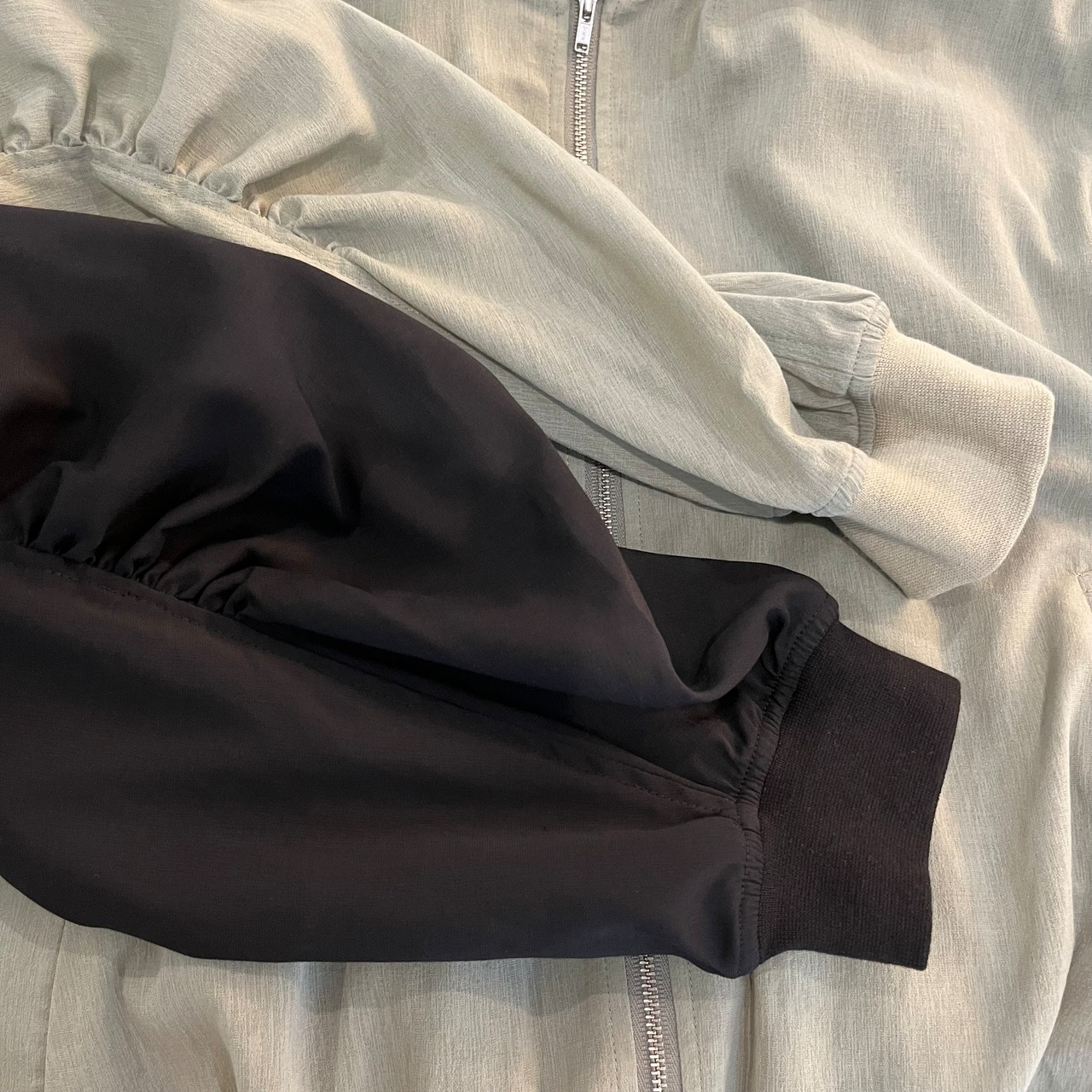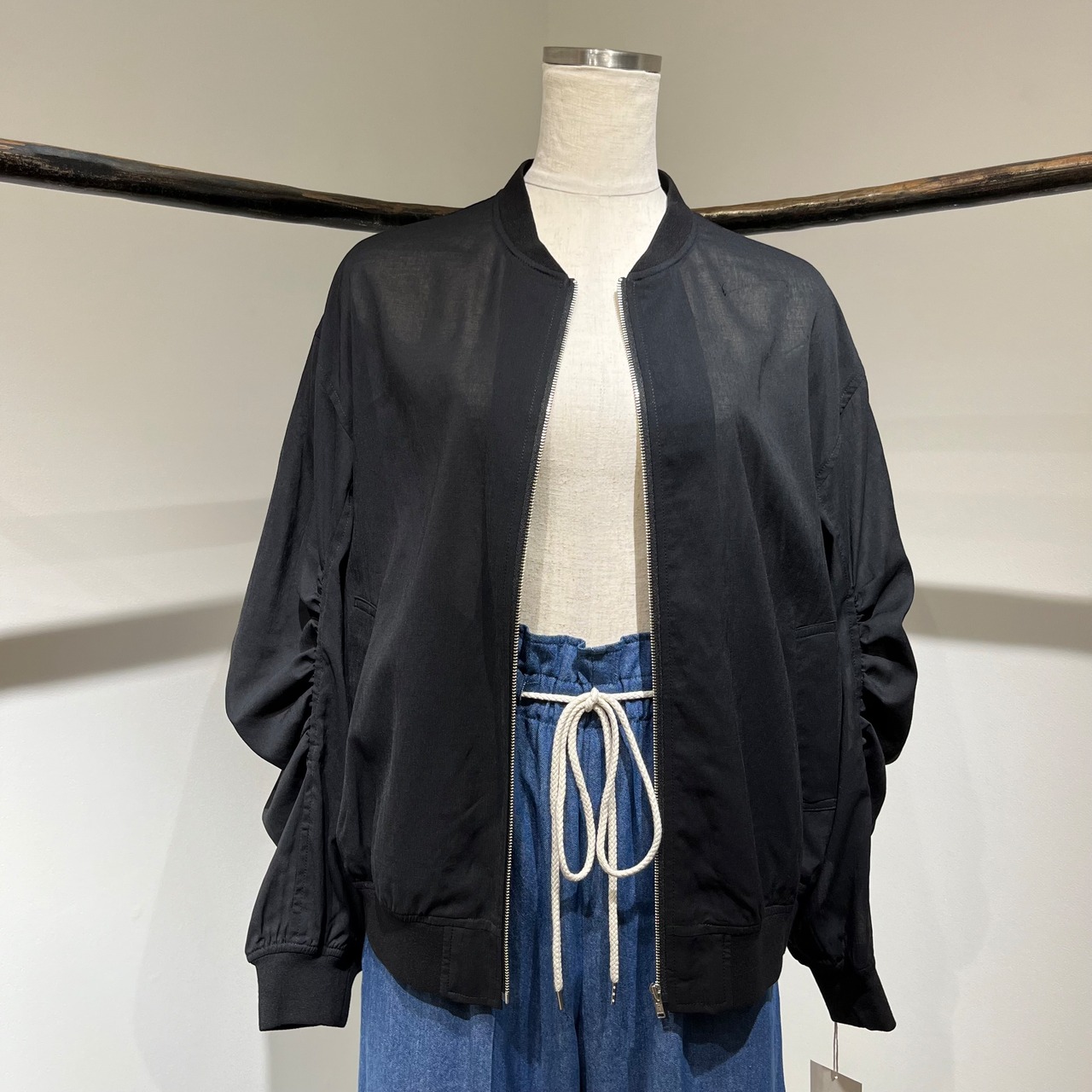 これからの季節にちょうどいいシアーブルゾンです。袖口もリブになっており、まくると腕のギャザーの形も可愛く出ます。